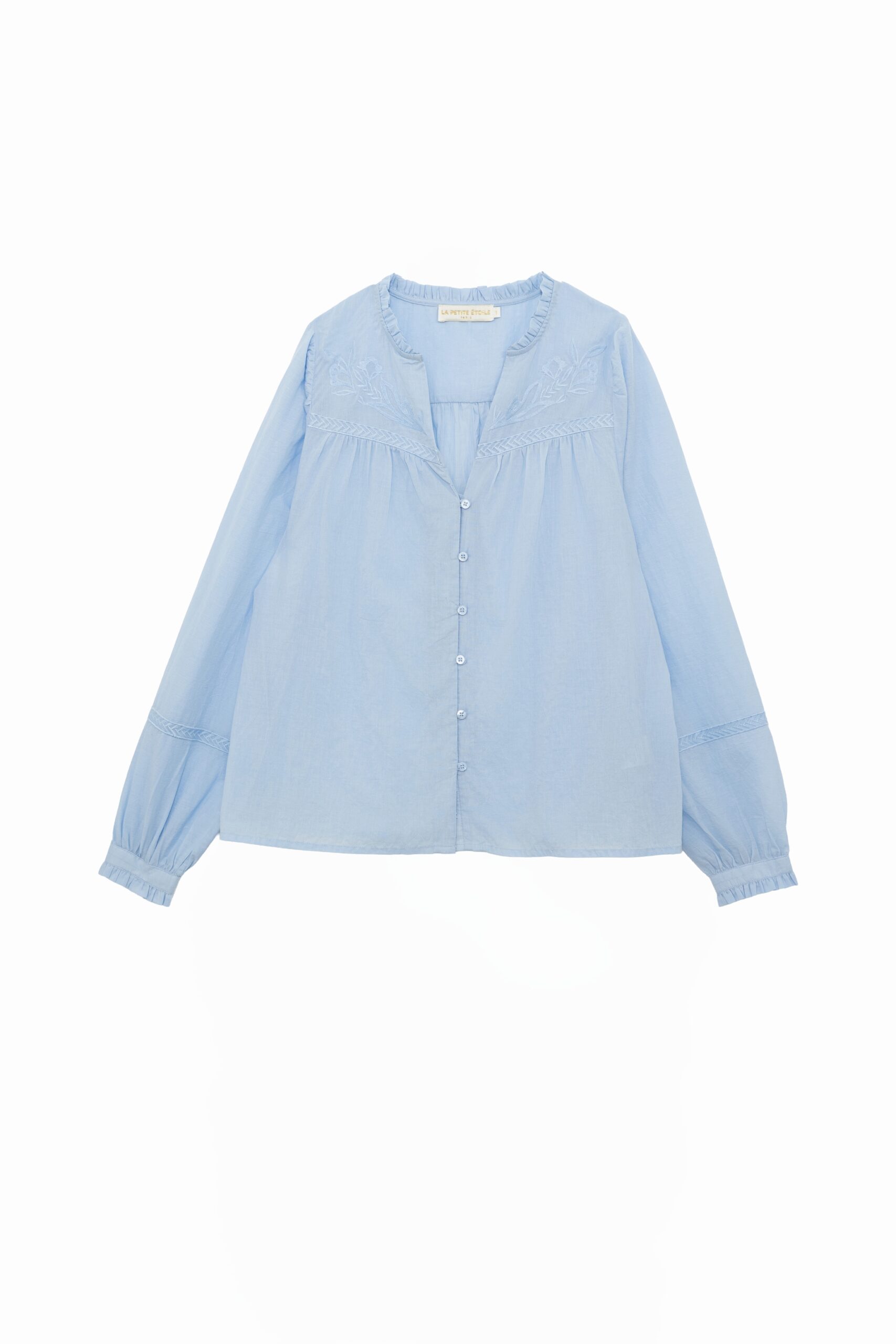 Blouse 100% coton à coupe droite ample avec encolure V à volants, manches longues et poignets boutonnés : un modèle confortable, féminin et facile à porter, idéal pour un style estival ou mi-saison.