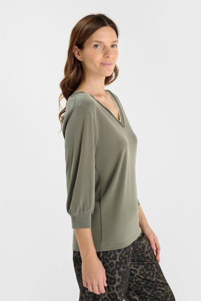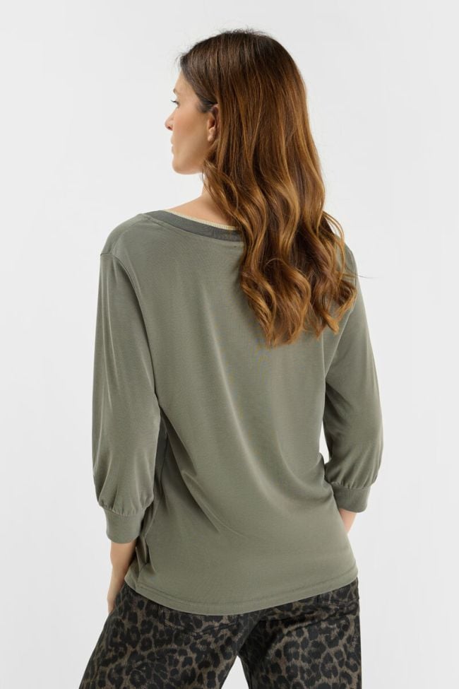T-shirt kaki à manches 3/4, col V et liseré contrasté.